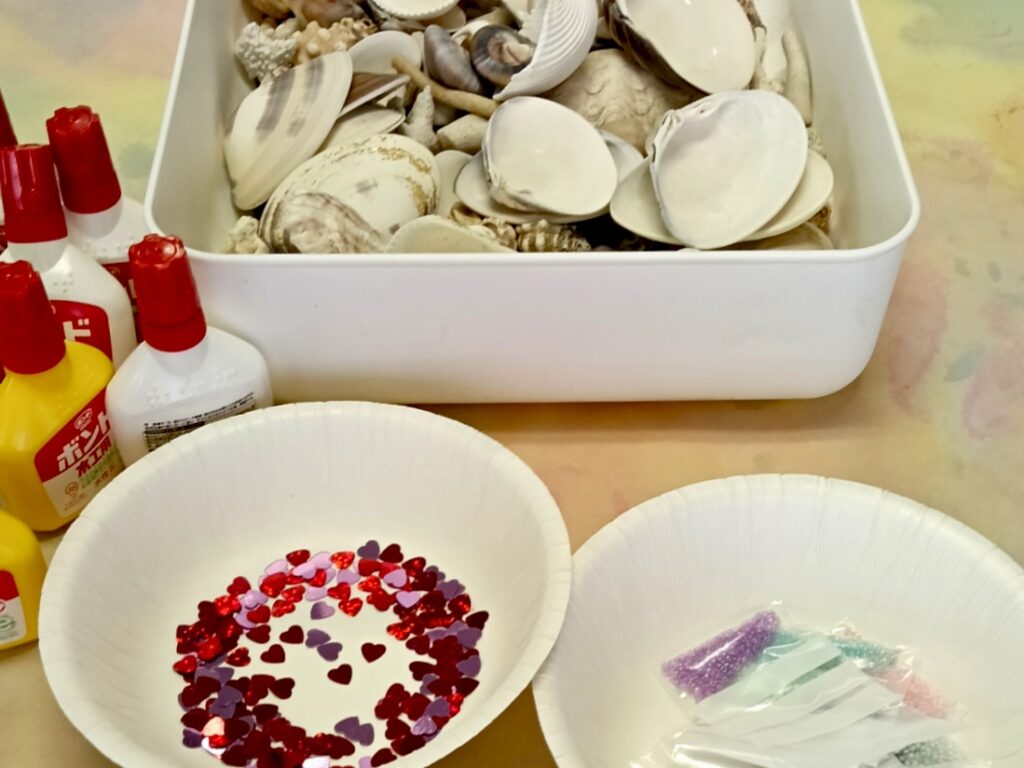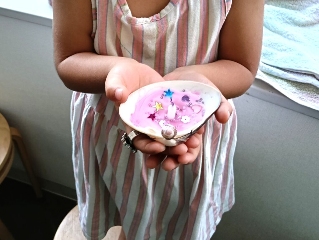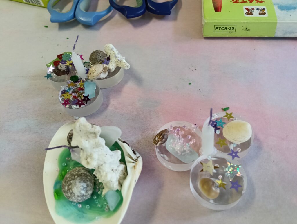 「夏の思い出」をテーマに、貝殻やシーグラス、ビーズで思い思いのキャンドルを作りです。