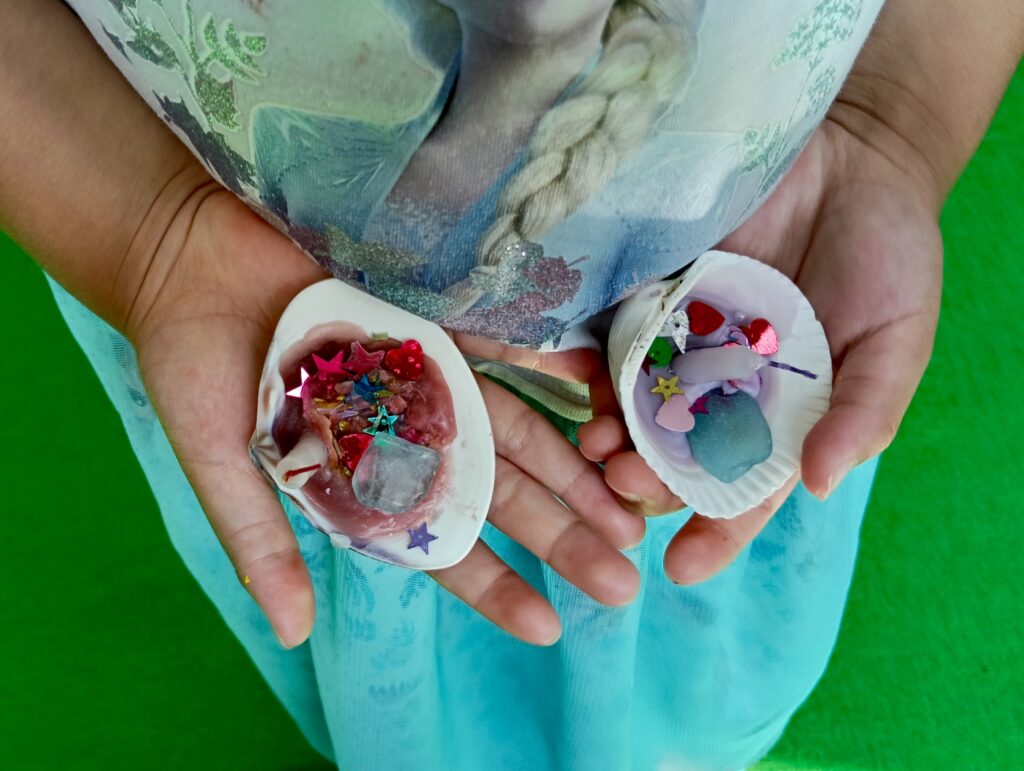 クレヨンで色付けしたらシーグラスやビーズでデコレーション。